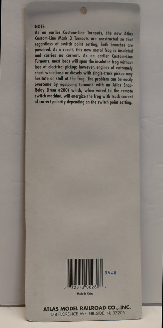 Atlas HO 280 - HO Custom-Line "Mark-3" Turnout (WYE Turnout) -Open Box-H1036