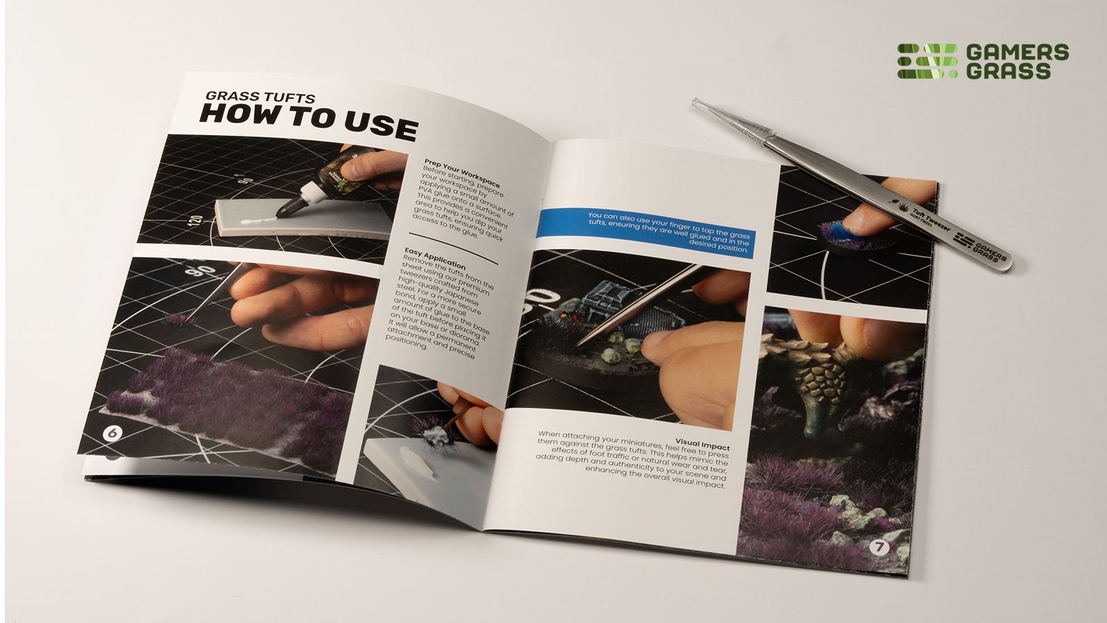 This Starter Box contains 4 full sheets of Grass Tufts, 1 Pair of Tweezers, 1 Bottle of PVA glue and 1 Basing Guide Booklet.