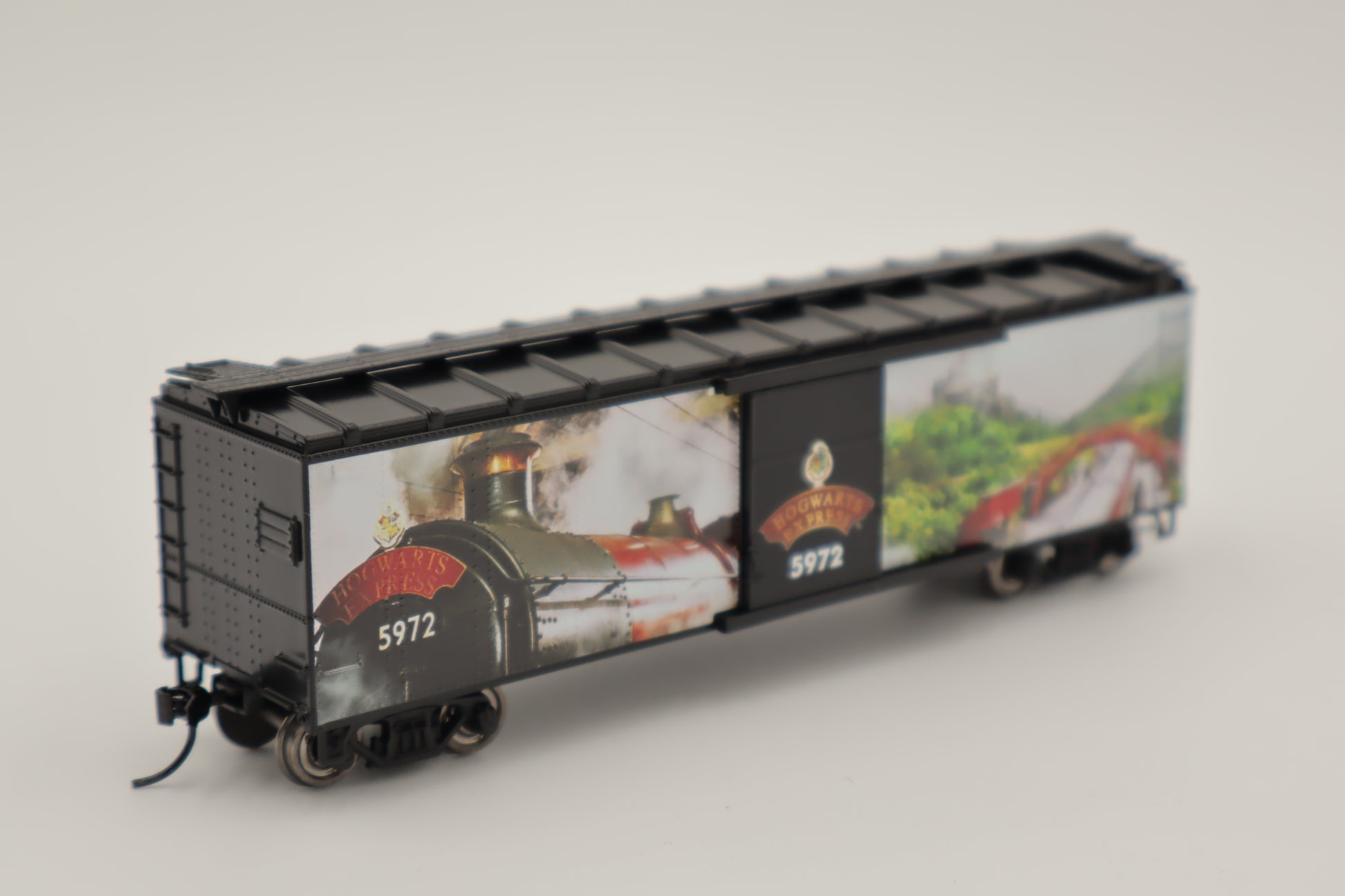 Grow your HO consist with this Harry Potter Sorcerer's Stone Movie Boxcar Boxcar! WIZARDING WORLD characters, names and related indicia are © & ™ Warner Bros. Entertainment Inc. Publishing Rights © JKR. Opening doors Metal wheels Metal knuckle couplers Weighted for reliable operation Length: 6.4" Minimum Curve: 18"