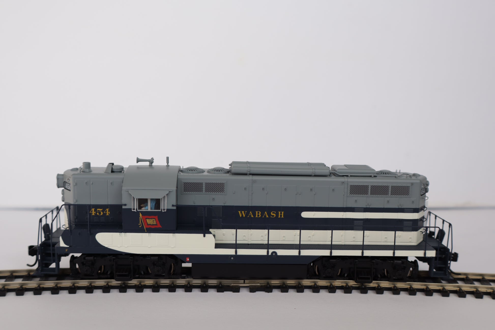 Wabash • Based on units in operation from the 1950s through the late 1960s • Brass single-chime air horn • Brass firecracker-style antenna • Roof-mounted air tanks with piping • Non-dynamic long hood • Operating Gyralight upper headlight & emergency stop signal (DCC only) lower light • Early Pyle dual sealed-beam headlights • Winterization hatch with etched-metal grill • Steam generator equipped with etched deflector • Etched-metal sunshades • Short MU stands • 1200-gallon fuel tank with dual 600-gallon water tanks • Roller bearing journals • Short-hood forward operation